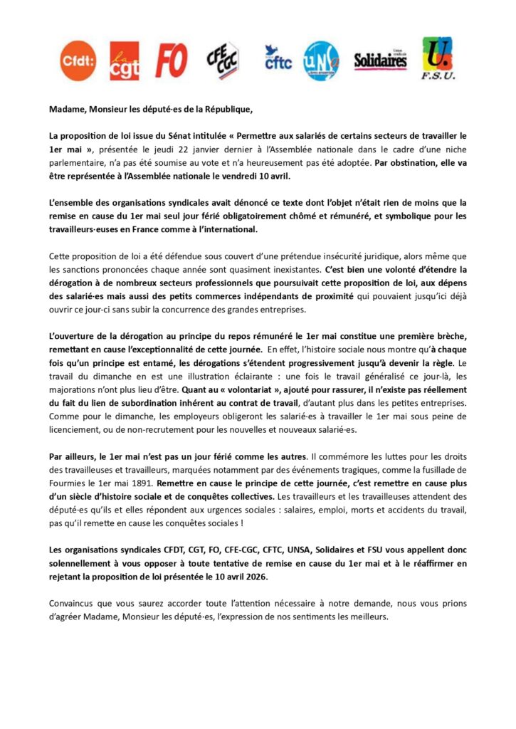 Toujours totalement opposée à ce texte, l’intersyndicale a décidé d’interpeller les députés afin qu’ils rejettent cette proposition de loi. Toute remise en cause du 1er mai, et toute dérogation au principe du repos rémunéré attaché à cette journée, constituerait une attaque directe contre le monde du travail et un recul social inacceptable.