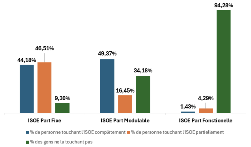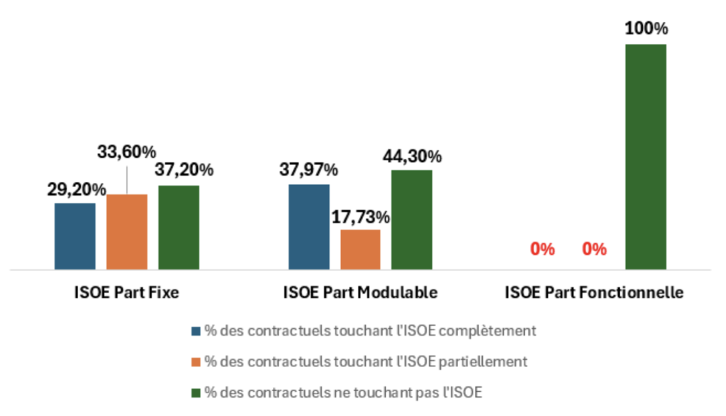 Le versement de l’ISOE est particulièrement révélateur à cet égard. Les tableaux récapitulatifs qui suivent mettent en valeur le pourcentage des enseignants qui bénéficient de l’ISOE. Ils soulignent les disparités observées dans les deux catégories pour le versement de chaque part. Si les bénéficiaires titulaires représentent à peine 50% des effectifs dès qu’il s’agit de la part fixe ou de la part modulable, les contractuels voient leur score s’effondrer pour la part fixe, sans jamais décoller pour la part modulable. Quant à la part fonctionnelle, si elle est purement anecdotique pour les enseignants titulaires, elle est carrément inexistante pour les contractuels.