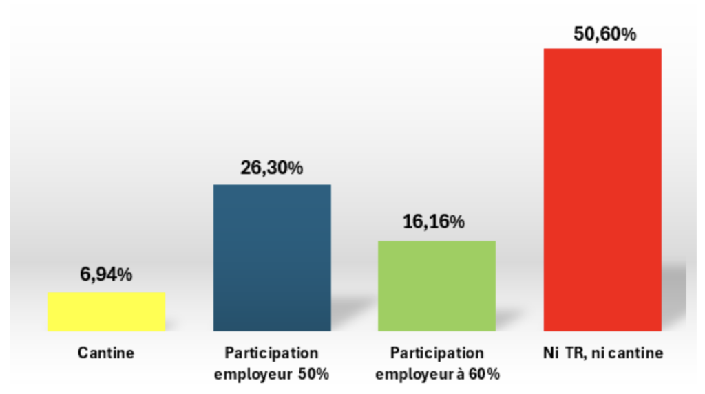 Dans quelques cas, l’employeur propose les services d’une cantine, mais la majorité des collègues déclarent ne bénéficier ni d’une cantine, ni de tickets restaurant.